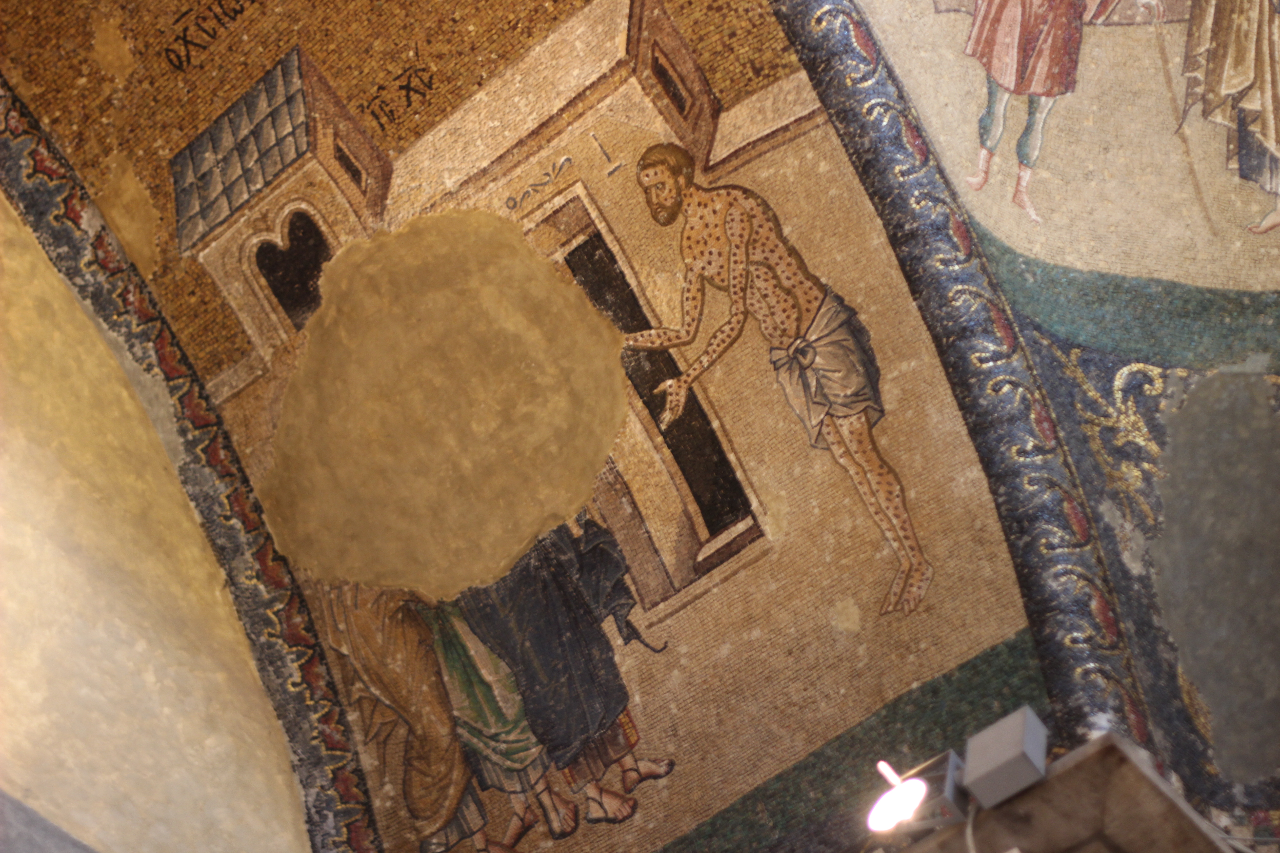 When you get to the building, don’t expect to be overwhelmed. This is not a church on the scale of Hagia Sophia. Not even close. The current structure is a cute little late-Byzantine inscribed-cross church. When I last saw it, its outer structure was covered in scaffolding, and the nave was closed. But most of what you want to see is in the exonarthex, narthex, and parakklesion.